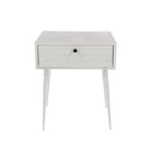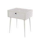 Strong, sturdy and stylish. Make a statement with this bedside cabinet created entirely from metal and finished in a white paint with contrasting gold effect handle. The drawer unit features a honeycomb design which is pressed into the panels which creates a three dimensional effect. The drawer also has the same effect to the front which is completed with a gold coloured handle. Inside the drawer box is also made from metal with a painted finish and easy glide metal runners. The look is completed with Mid-Century styled tapered metal legs, which elevate the bedside making cleaning so easy, an ideal choice for use as a bedside or side table.