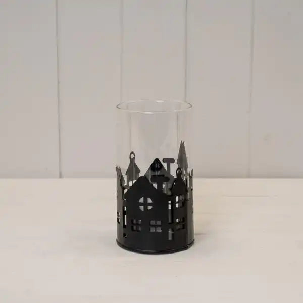 Small Black Metal House Scene Candle Holder with Glass Insert