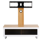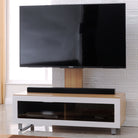 Contemporary, pedestal TV stand with swivel VESA compatible bracket and infrared-friendly glass-fronted cabinet.