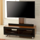Contemporary, pedestal TV stand with swivel VESA compatible bracket and infrared-friendly glass-fronted cabinet.