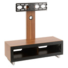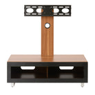 Contemporary, pedestal TV stand with swivel VESA compatible bracket and infrared-friendly glass-fronted cabinet.