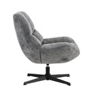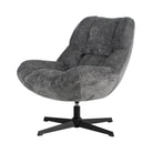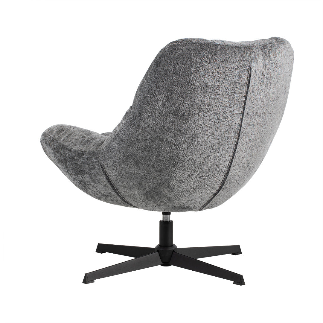 This lounge chair offers a stylish and comfortable seating experience with a practical swivel function. Upholstered in soft grey chenille, it adds texture and warmth to any interior. The seat height is 45 cm, and the chair stands on a sturdy iron base with black powder coating, combining elegance with durability. Perfect for relaxed seating in the living room or reading corner.