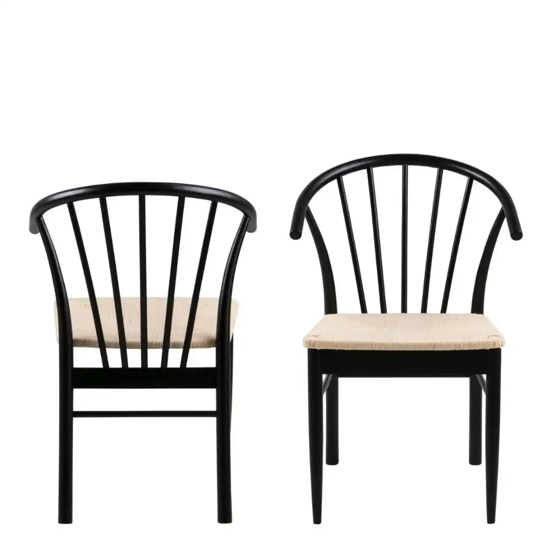 - The Cassandra chairs are the stylish sidekicks to this showstopper table. With their black lacquered oak frames, spoked backrests, and comfy armrests, they're here to support you. The off-white paper-plaited seats with a woven pattern? A hint of Scandinavian design that balances sophistication with a relaxed, modern style.