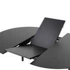 - The table boasts a matt black oak veneer top and a smooth butterfly extension mechanism, effortlessly transforming from cosy (115 cm) to party-ready (154 cm). Its black lacquered base and rounded edges scream sophistication without trying too hard, making it a match made in heaven for any modern interior.