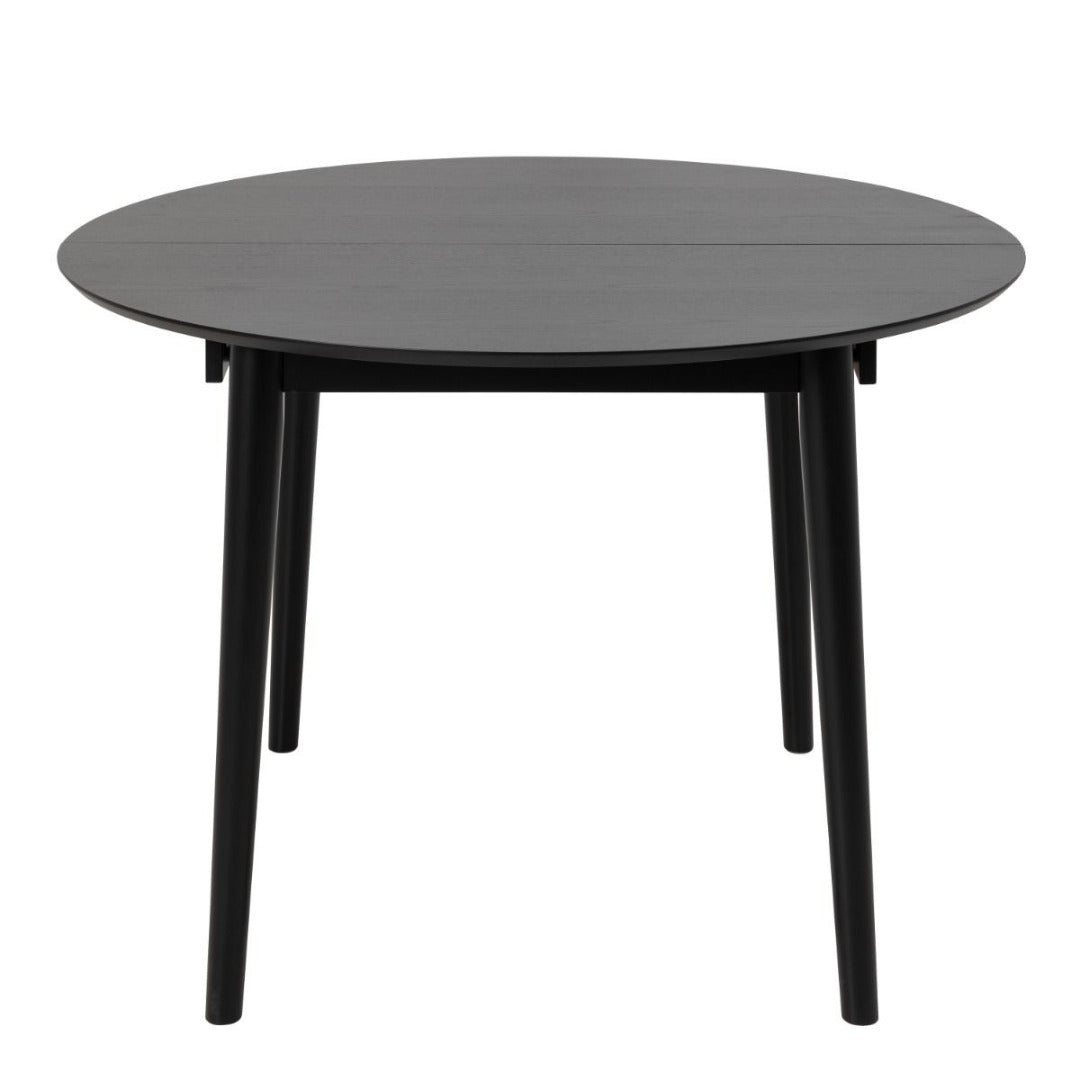 Elegant round dining table with soft edges and black oak veneer. Easily extend the surface with a simple butterfly extension to gather the whole family.