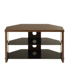 Modern and stylish TV stand, a wooden top and side panels, chamfered corners and two tinted glass shelves.