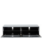 The Sorrento TV stand is elegantly finished with a colour-matched bonded glass top and matching glass drop-down front door (2 doors on the 160 cm cabinet). Remote-friendly printed matrix on the doors means all your electronic items remain hidden yet can be operated without having the doors open.