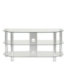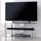 Simple and minimalist, the Vantage TV stand will create an eye-catching focal point in your living room. It is finished with tubular aluminium legs either in chrome and clear glass or matt black with black glass. The chamfered corners mean the stand is ideal for positioning in the corner of the room but also looks good against a living room wall. The three curved glass shelves give plenty of storage space for your electronic accessories, such as a DVD player, satellite box, game console and soundbar.