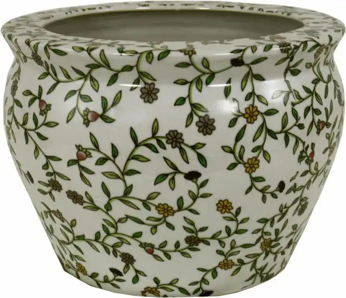A glazed ceramic planter with a vintage green and white floral design. These ceramic planters are a must-have when it comes to gardening. They would look fantastic as a statement piece in your garden or your patio. The material is resistant to frost, so you can be sure your planters will be safe during those colder months. Equally at home as indoor planters for your conservatory or hallway. The pot is ceramic with a transfer printed design.Internal dimensions of pot, diameter 19cm, height 18cm. Measurements: 25.3 x 18.7 x 25.3cm