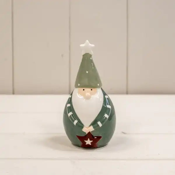 A sweet ceramic gonk in woodland green and snowy white—adds a whimsical Nordic touch to festive décor.