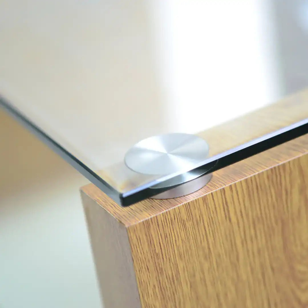 - Modern design using contrasting laminated wood panels and toughened glass shelves.