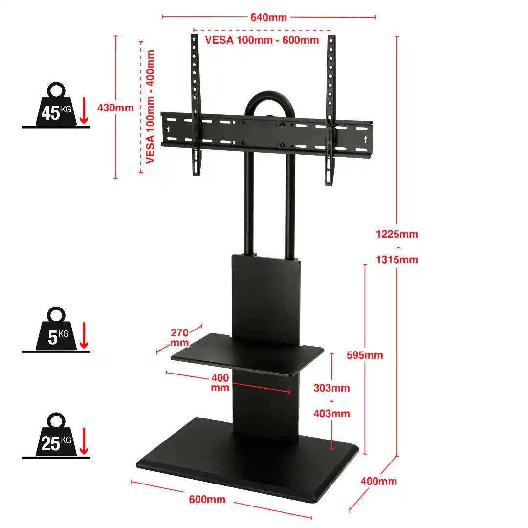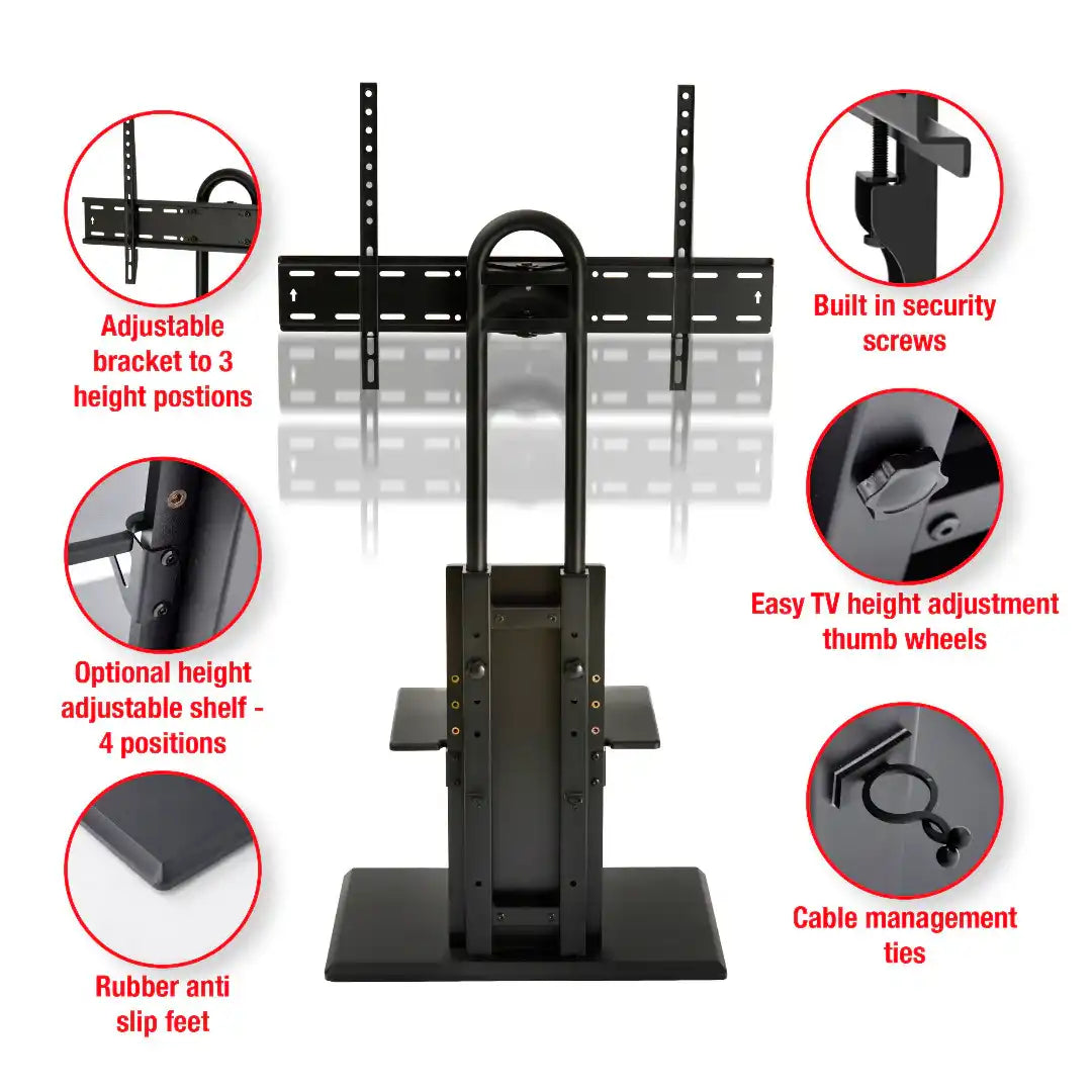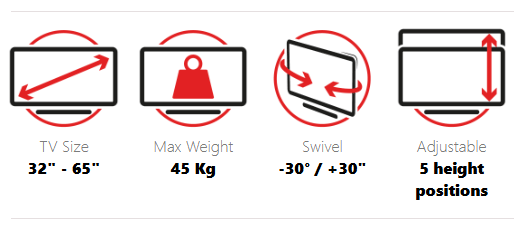 - Compatibility – Suitable for TVs ranging in size from 32 inches to 65 inches. The bracket has a maximum load capacity of 45 Kg, the bottom plinth 35 Kg, and the optional shelf has a 5 Kg capacity.