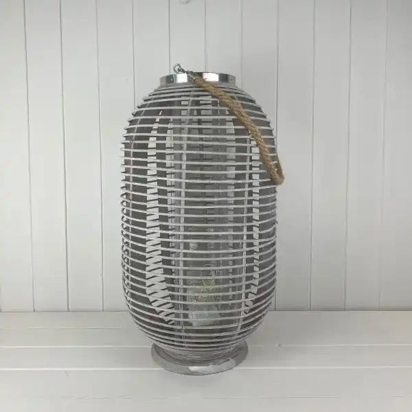 A tall, beautifully greywashed rattan lantern—perfect for adding soft, natural ambience indoors or out.
