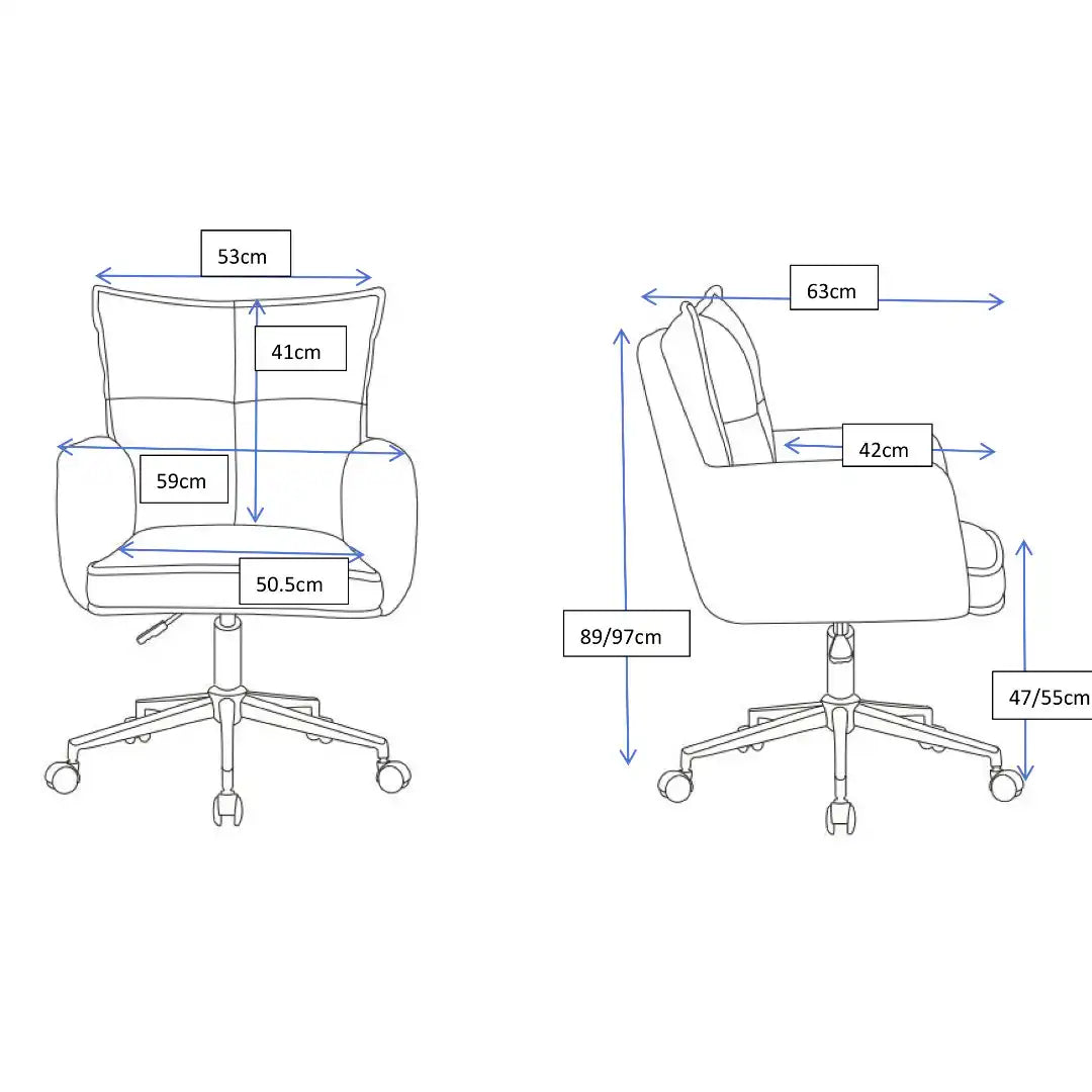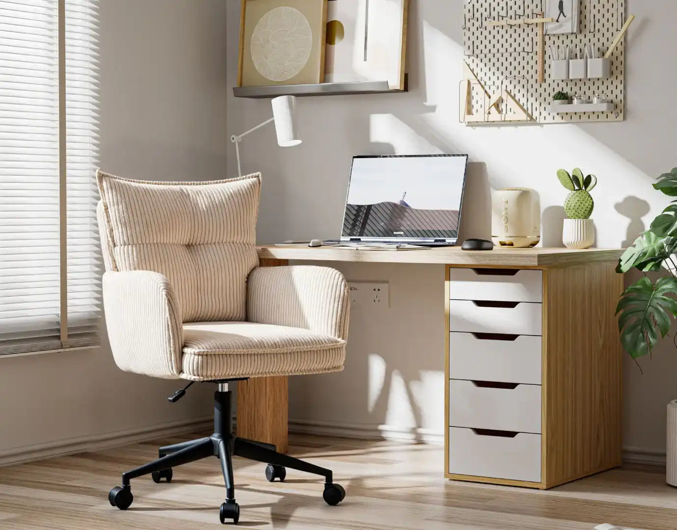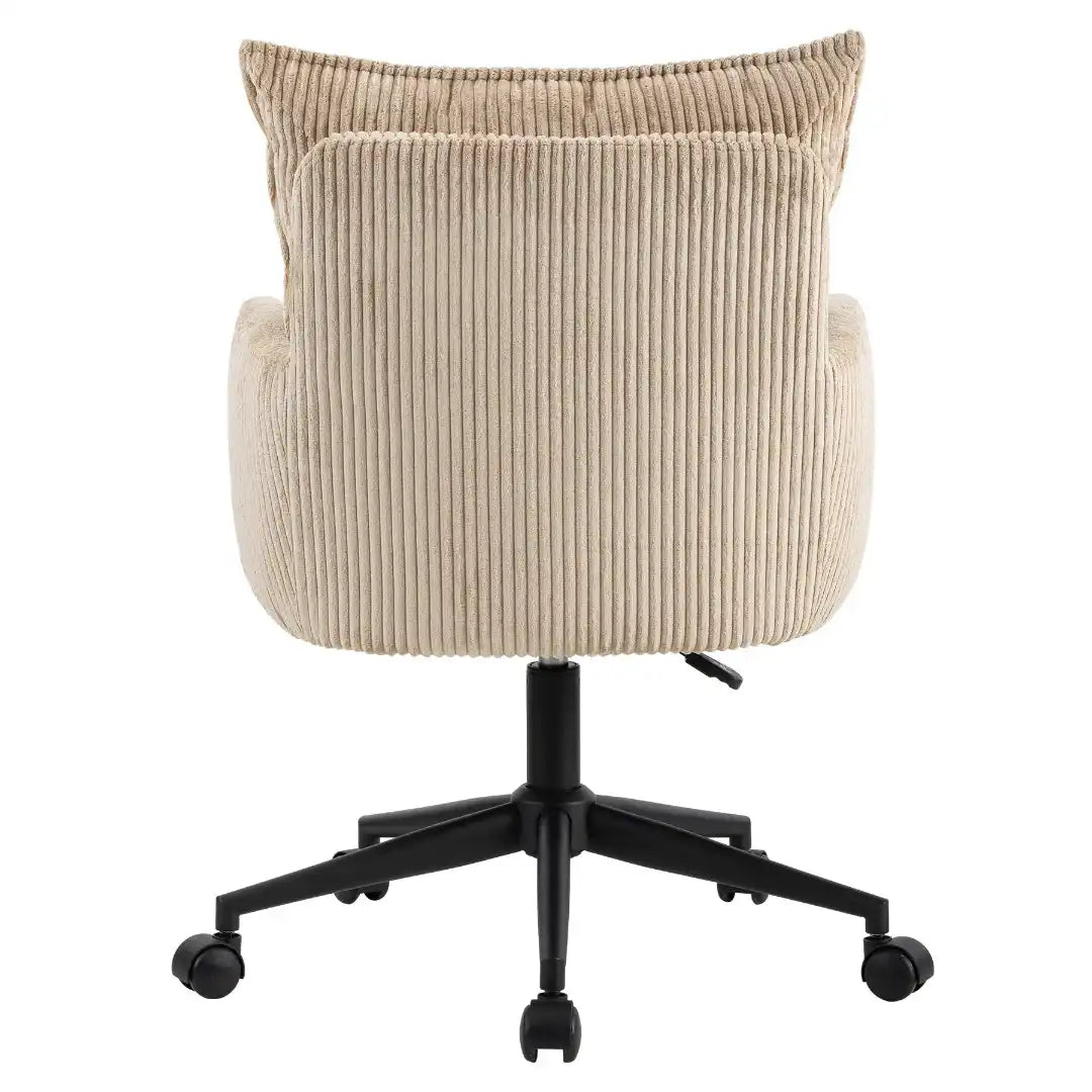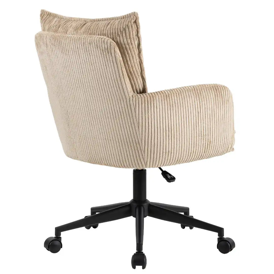 This cream corduroy office chair combines elegant design with everyday practicality. It includes two armrests for added comfort, a gaslift for adjusting the seat height between 47 and 55 cm, and a durable 5-star base in black powder-coated metal. The soft corduroy fabric in a neutral tone makes it a stylish addition to any workspace.