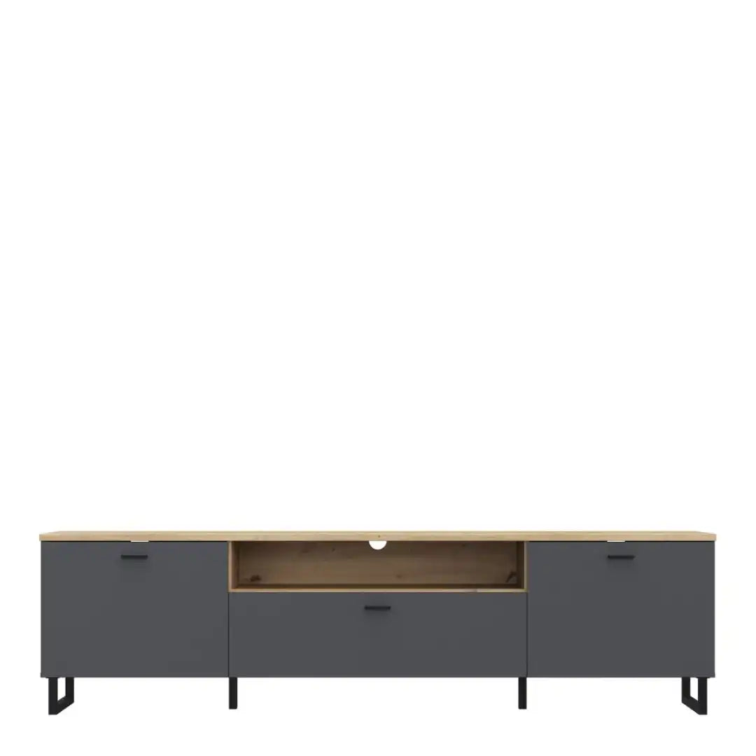 Shop the Klara TV Unit with a modern Grey and Oak finish, featuring 1 drawer and 2 flip doors for stylish and practical storage. Its Artisan Oak top and Uni Wolfram Grey body deliver a balanced blend of warmth and sophistication, making it an elegant addition to any living room. But it's not just about looks, this unit features integrated LED lighting that adds a soft, ambient glow, turning your entertainment setup into a true style statement. Built to hold televisions up to 86 inches with a sturdy 40 kg capacity, it's ready to handle even the largest setups with ease. Whether you're going for bold drama against a dark wall or a fresh, contemporary vibe with lighter tones, the Klara TV Unit seamlessly elevates your space. This TV unit is as practical as it is visually appealing, featuring 1 spacious drawer and 2 flip doors to store media equipment, game consoles, or remotes neatly out of sight. The LED lighting accentuates the modern design, making it a standout piece when paired with the Klara wall shelf featuring LED lights. Complete the look by pairing it with a Klara 2 Door Display Cabinet to create a harmonious and polished ensemble. Whether styled with grey sofas and wooden coffee tables, or complemented by wood-finished interiors and accessories, the Klara TV Unit is the ultimate centrepiece that enhances both the function and aesthetic of your living room.
