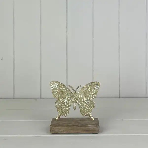 A pretty green metal butterfly mounted on a wooden base—fresh and uplifting for desks, shelves and seasonal décor.