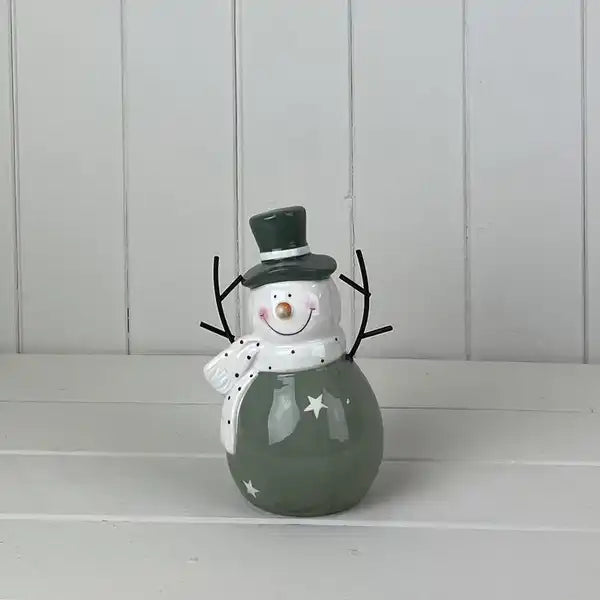 A cheerful ceramic snowman in soft green and white tones, ideal for bringing playful festive warmth to shelves, mantels or winter displays.