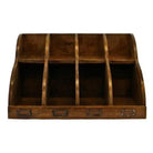 Part of our rustic Country Cottage range of products, this desktop storage unit has 8 spaces for storage with slots for labels to the front. The nameplate card insert size is 35 x 17mm with a display area of 32 x 12mm (not included). The top sections measure W8.5 D10 H7.5cm, bottom sections W8.5cm D21.5 H13cm. All products in this range are hand finished and will have natural wood variation. Made of high quality mango wood with metal label slots. Measurements: 24 x 23 x 40cm