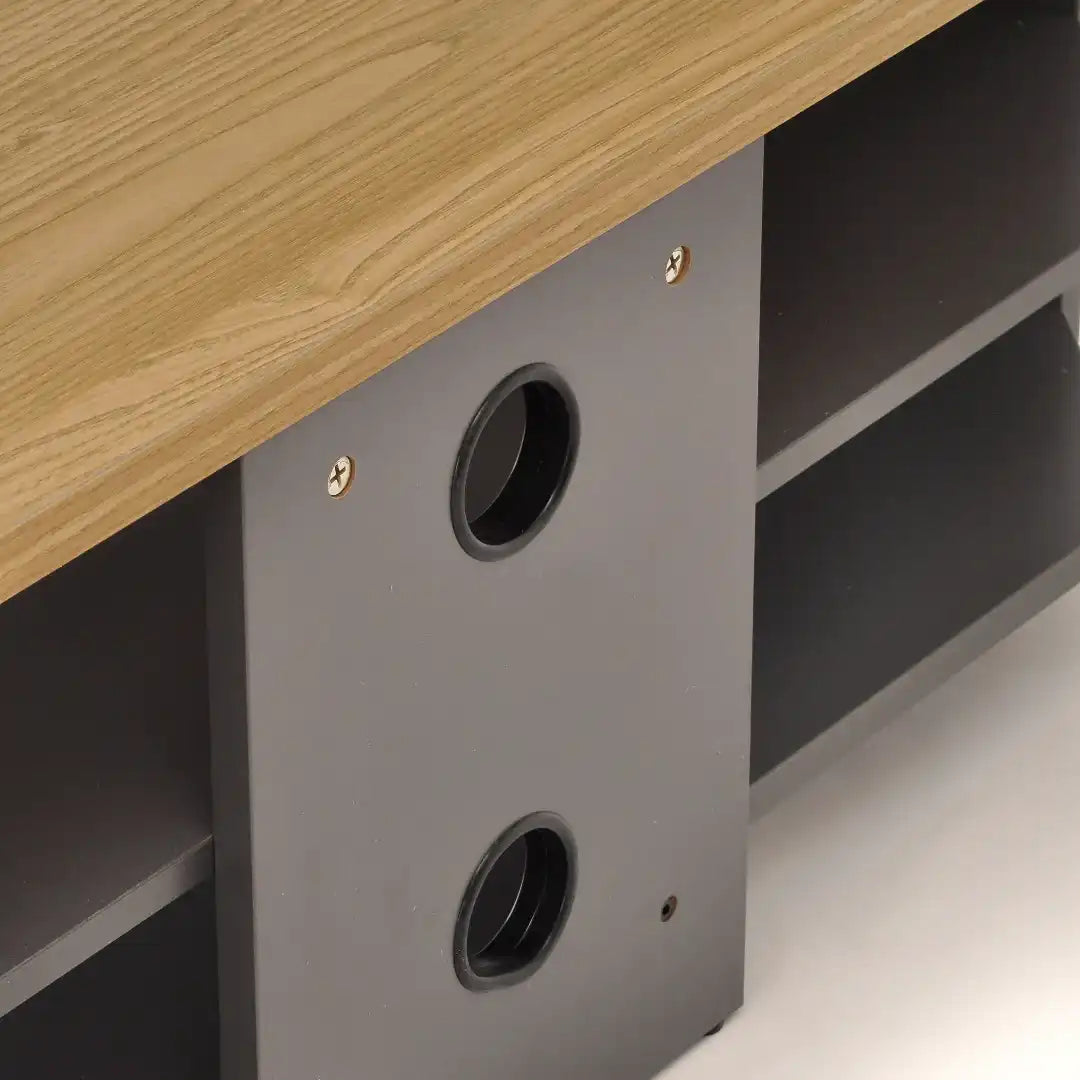 There is plenty of space to store your electronic accessories, such as a DVD player, satellite box or soundbar. The cable management leg on the rear hides unsightly wires. The middle shelf is height adjustable, providing more flexibility for additional storage.