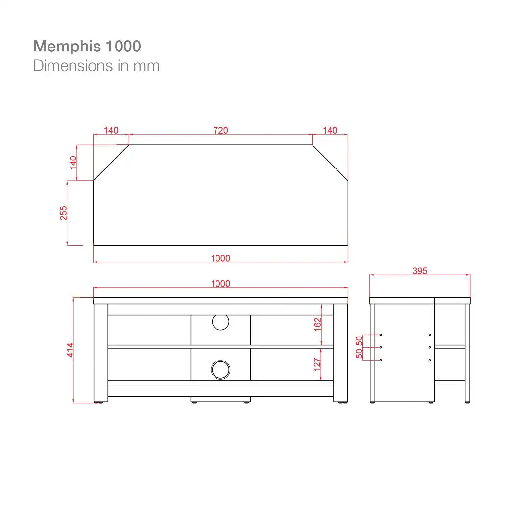 The TTAP Memphis TV stand will complement any room environment. The chamfered corners on the 1000, 1200 and 1400 Memphis TV stands make them ideal for placing in the corner of a room or flat against a wall. The Memphis 1600 and 2000 TV stands have been designed with straight corners, making them ideal for the biggest of TVs.
