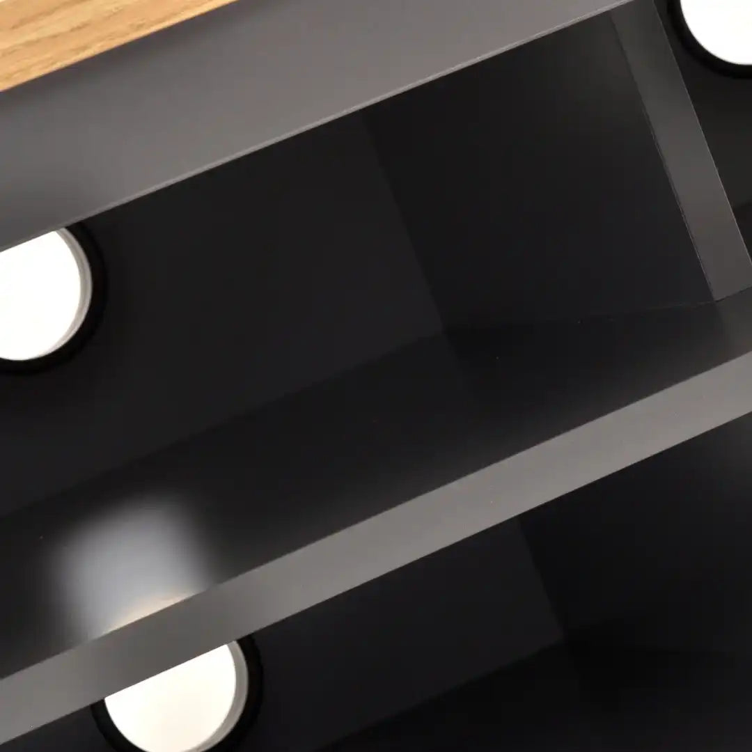 There is plenty of space to store your electronic accessories, such as a DVD player, satellite box or soundbar. The cable management leg on the rear hides unsightly wires. The middle shelf is height adjustable, providing more flexibility for additional storage.