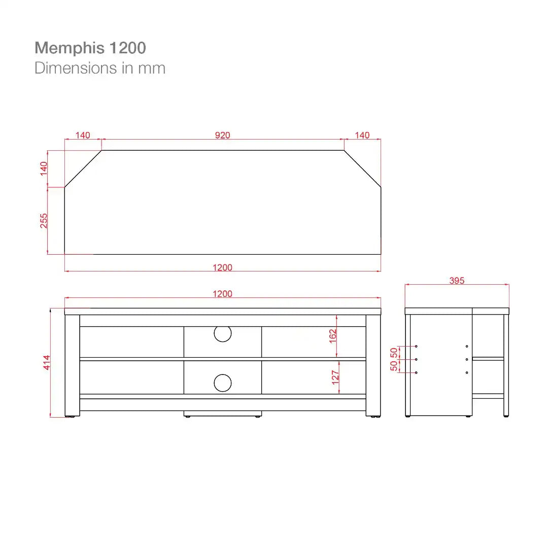 The TTAP Memphis TV stand will complement any room environment. The chamfered corners on the 1000, 1200 and 1400 Memphis TV stands make them ideal for placing in the corner of a room or flat against a wall. The Memphis 1600 and 2000 TV stands have been designed with straight corners, making them ideal for the biggest of TVs.