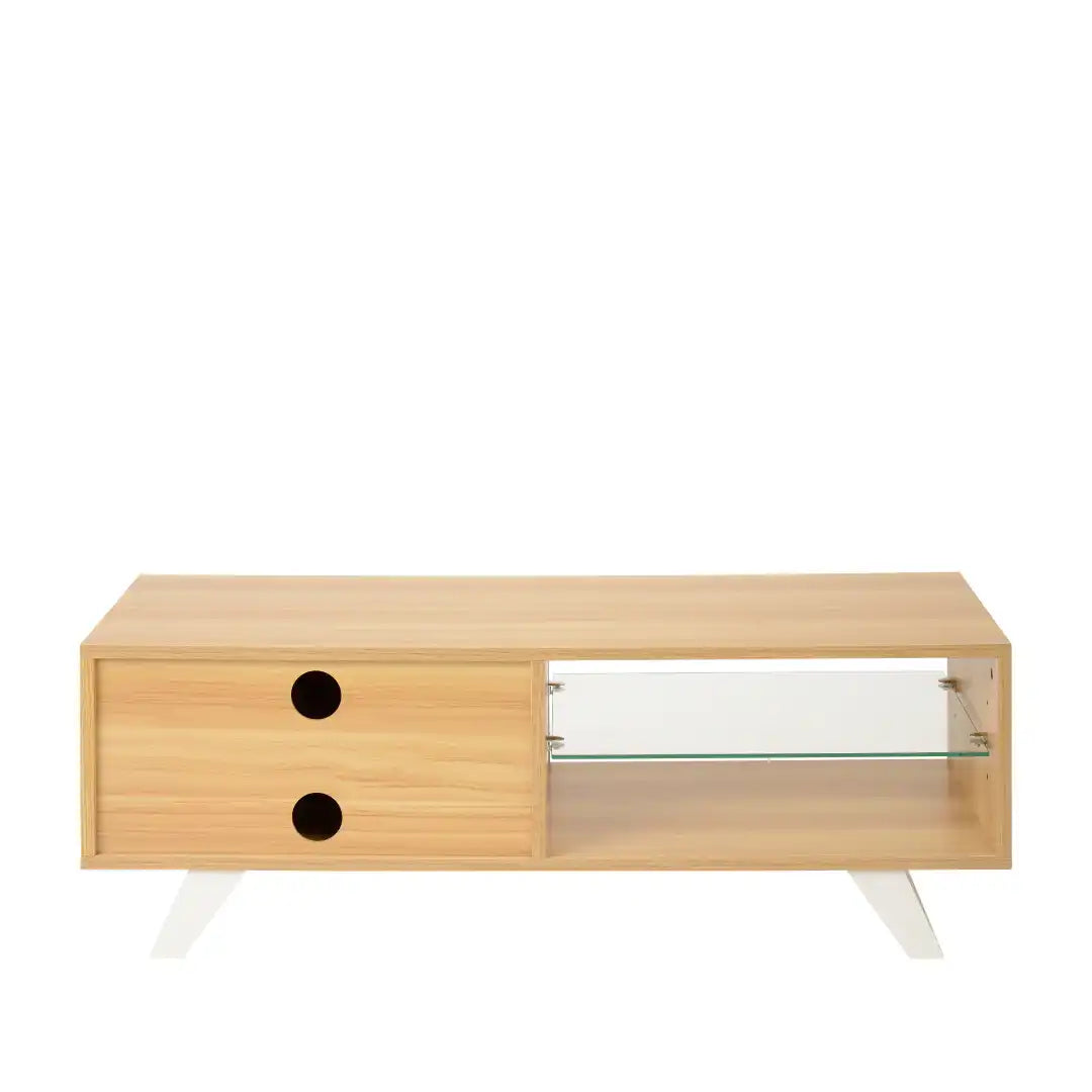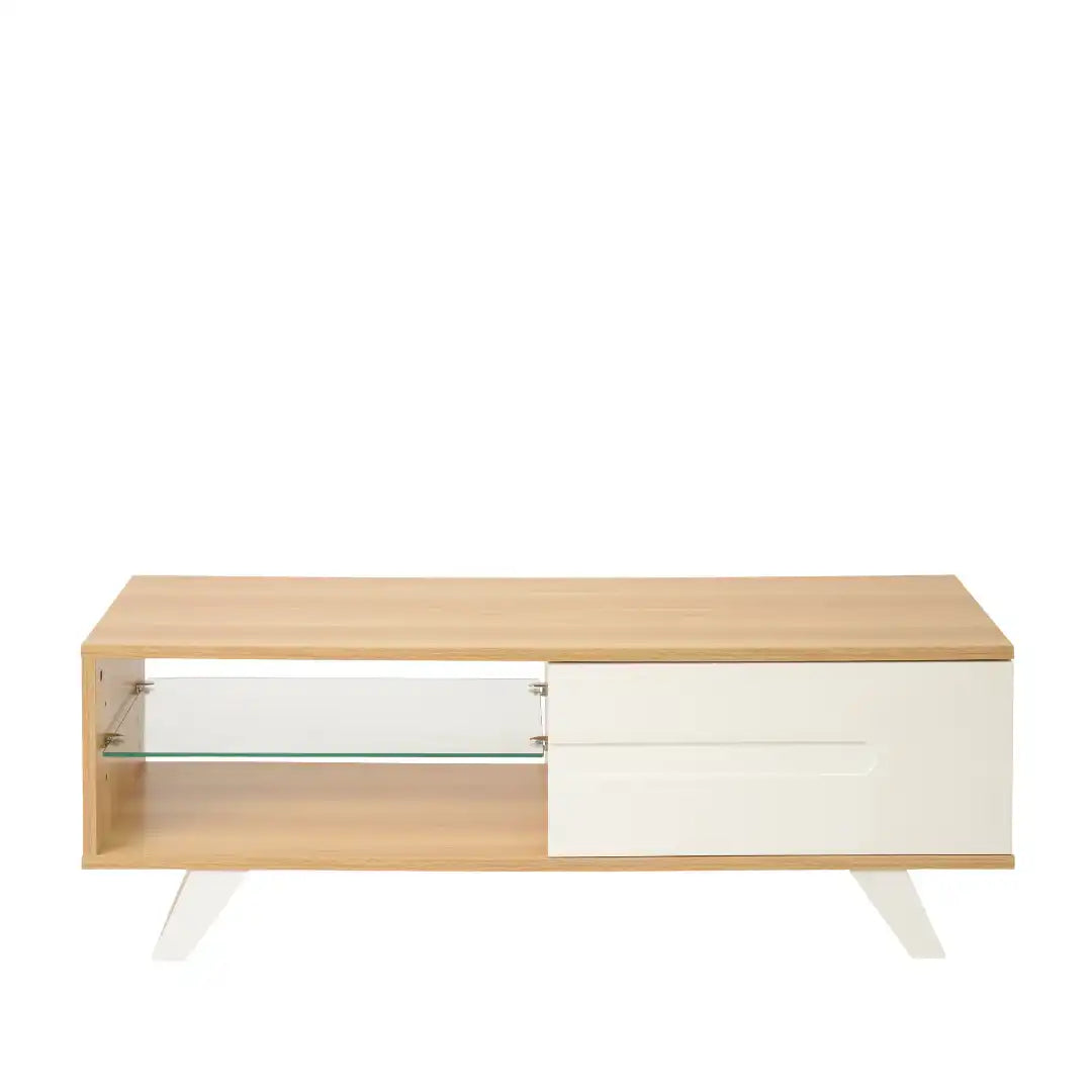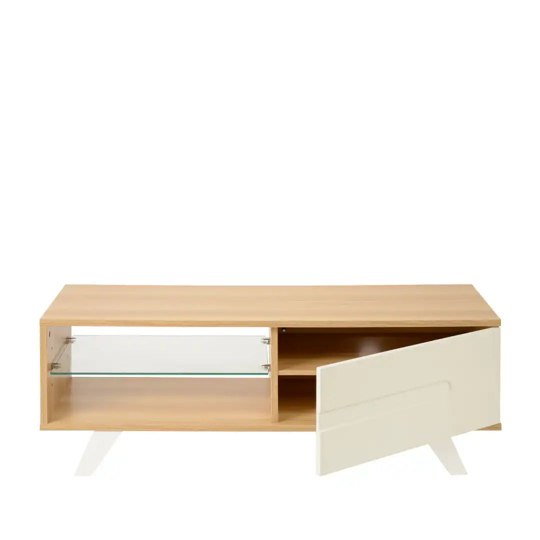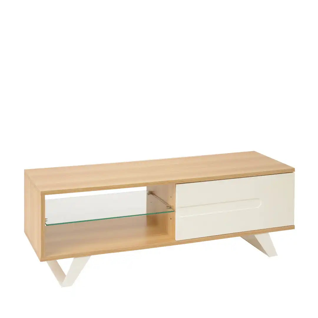 Modern-style TV cabinet combines an open area with a glass shelf and a storage cupboard with a contrasting satin-painted soft close door.