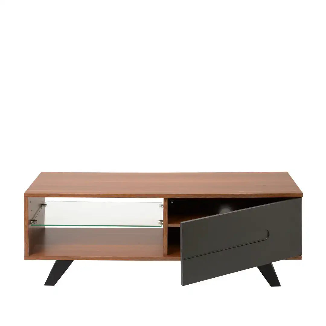 Modern-style TV cabinet combines an open area with a glass shelf and a storage cupboard with a contrasting satin-painted soft close door.