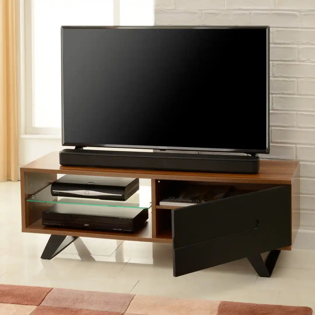 - ATTRACTIVE, VERSATILE DESIGN – Oak or walnut TV stand with contrasting satin painted soft close door is perfect for placing in your living room either flat against the wall or in the corner of your room