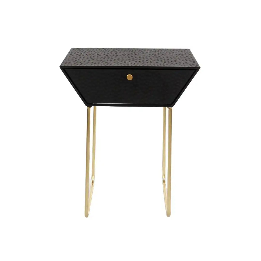 Dare to be different with this bedside cabinet created entirely from metal and finished in a black paint with contrasting copper effect drawer front. The drawer unit features a hammered design which is pressed into the panels to create a three dimensional effect. The drawer also has the same effect to the front which is completed with a black handle. Inside the drawer box is also made from metal with a painted finish and easy glide metal runners. The unusual drawer unit and tubular leg design makes this a real standalone piece, ideal for a bedside unit or side table, place a lamp or plant on top to create an visual highlight for your home.