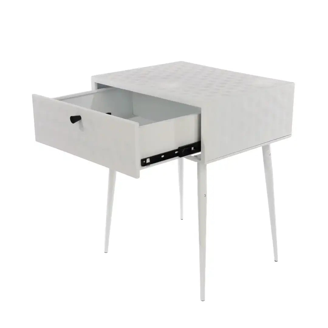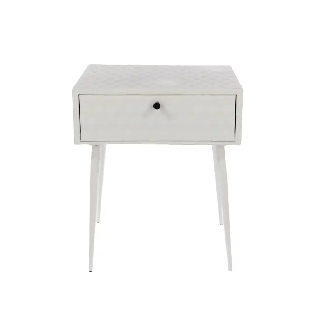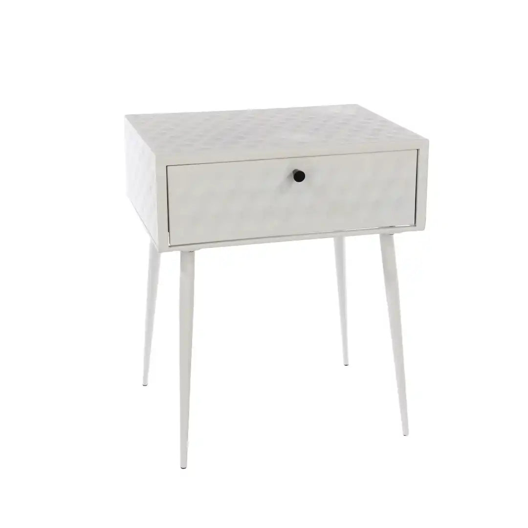 Strong, sturdy and stylish. Make a statement with this bedside cabinet created entirely from metal and finished in a white paint with contrasting gold effect handle. The drawer unit features a honeycomb design which is pressed into the panels which creates a three dimensional effect. The drawer also has the same effect to the front which is completed with a gold coloured handle. Inside the drawer box is also made from metal with a painted finish and easy glide metal runners. The look is completed with Mid-Century styled tapered metal legs, which elevate the bedside making cleaning so easy, an ideal choice for use as a bedside or side table.