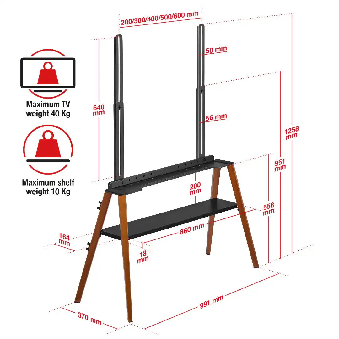 - Strength tested. Will hold TVs up to 40 Kg and shelf 10 Kg