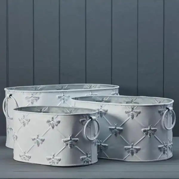 Set of Three White Oval Bee Zinc Planters L38cm M31cm S26cm
