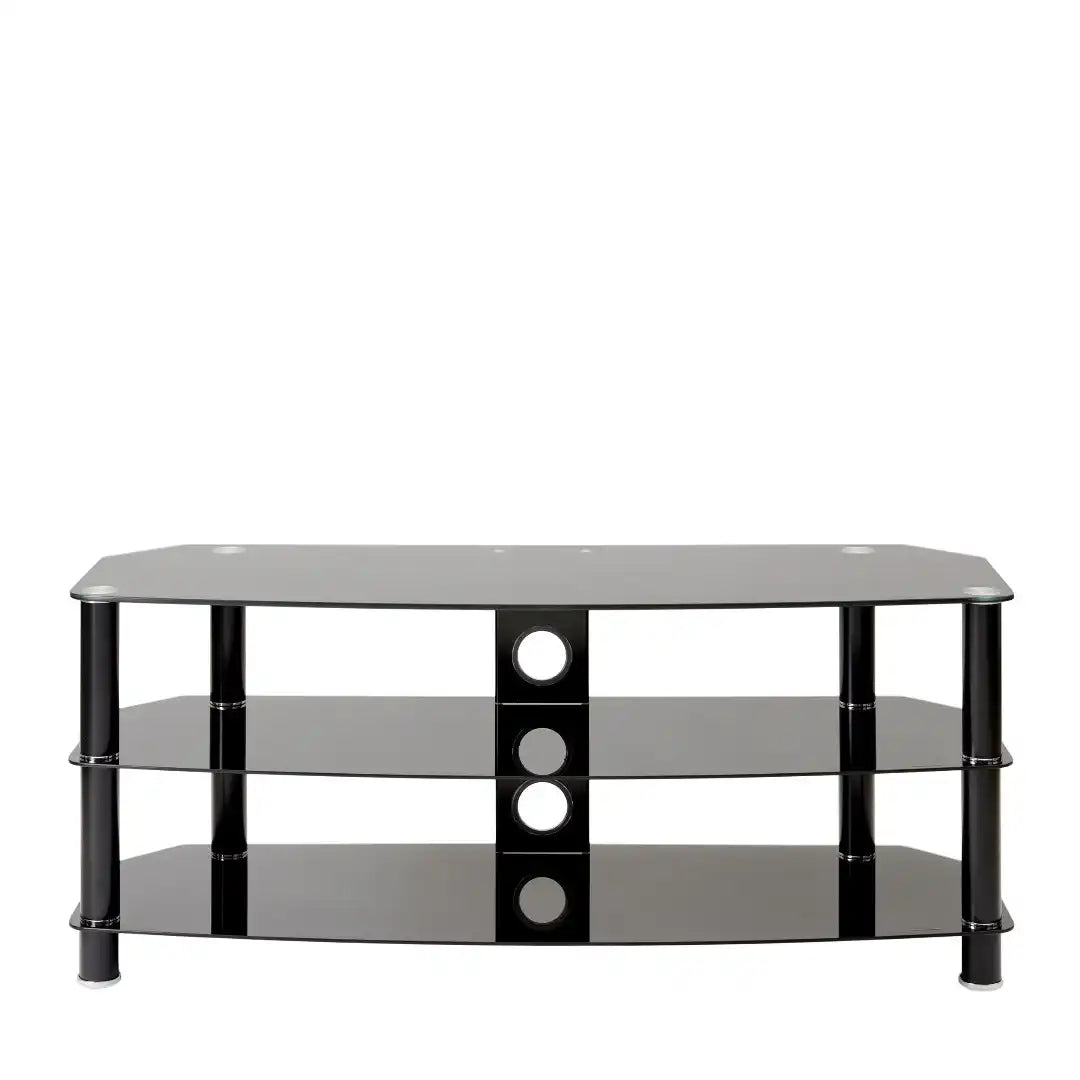 Simple and minimalist, the Vantage TV stand will create an eye-catching focal point in your living room. It is finished with tubular aluminium legs either in chrome and clear glass or matt black with black glass. The chamfered corners mean the stand is ideal for positioning in the corner of the room but also looks good against a living room wall. The three curved glass shelves give plenty of storage space for your electronic accessories, such as a DVD player, satellite box, game console and soundbar.