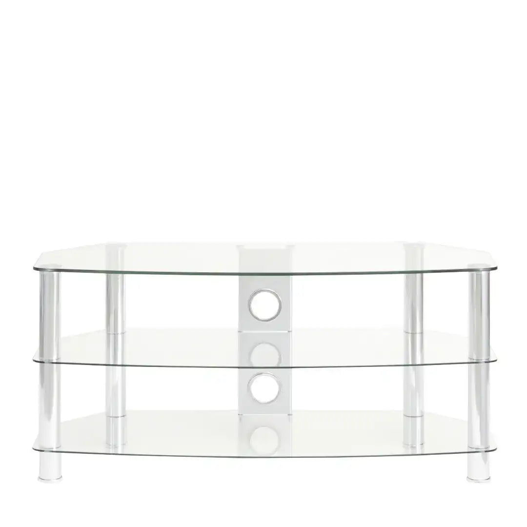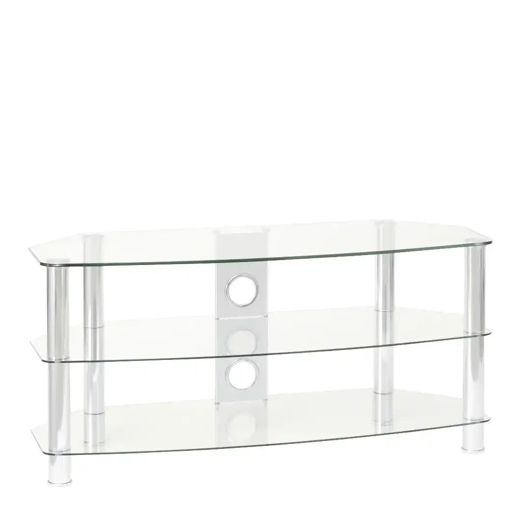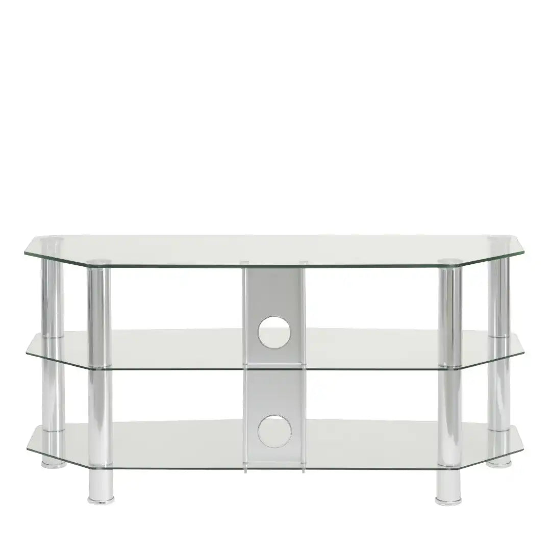 Simple and minimalist, the Vantage TV stand will create an eye-catching focal point in your living room. It is finished with tubular aluminium legs either in chrome and clear glass or matt black with black glass. The chamfered corners mean the stand is ideal for positioning in the corner of the room but also looks good against a living room wall. The three curved glass shelves give plenty of storage space for your electronic accessories, such as a DVD player, satellite box, game console and soundbar.