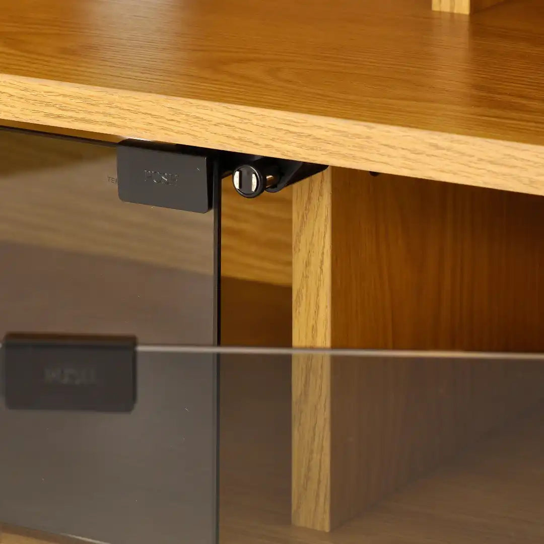 The cabinet has plenty of practical storage, below the TV is a double-capacity space ideal for a soundbar or for housing a DVD player, and a satellite box side-by-side. Underneath this is a further compartment with tinted soft-close glass doors, which can accommodate additional components, such as AV equipment and game consoles.