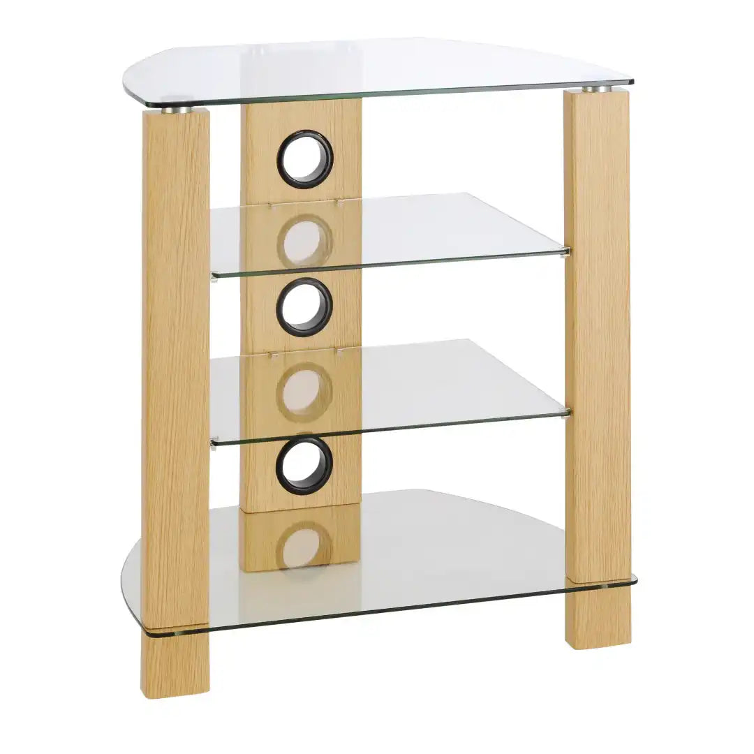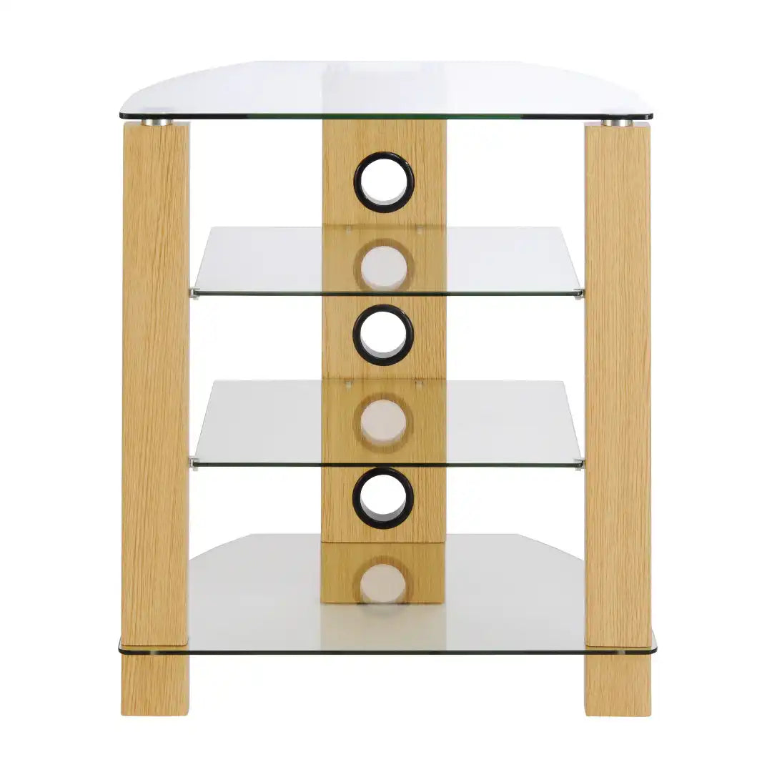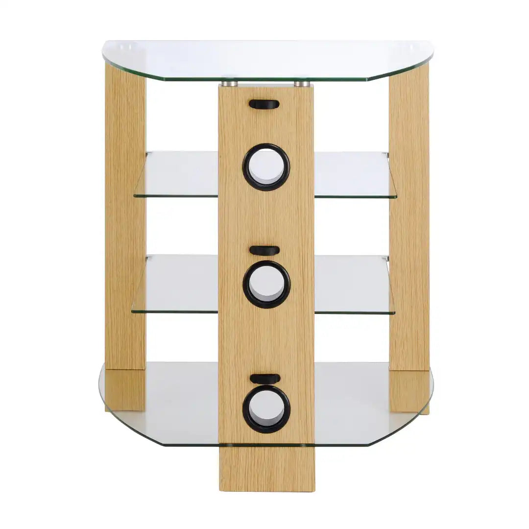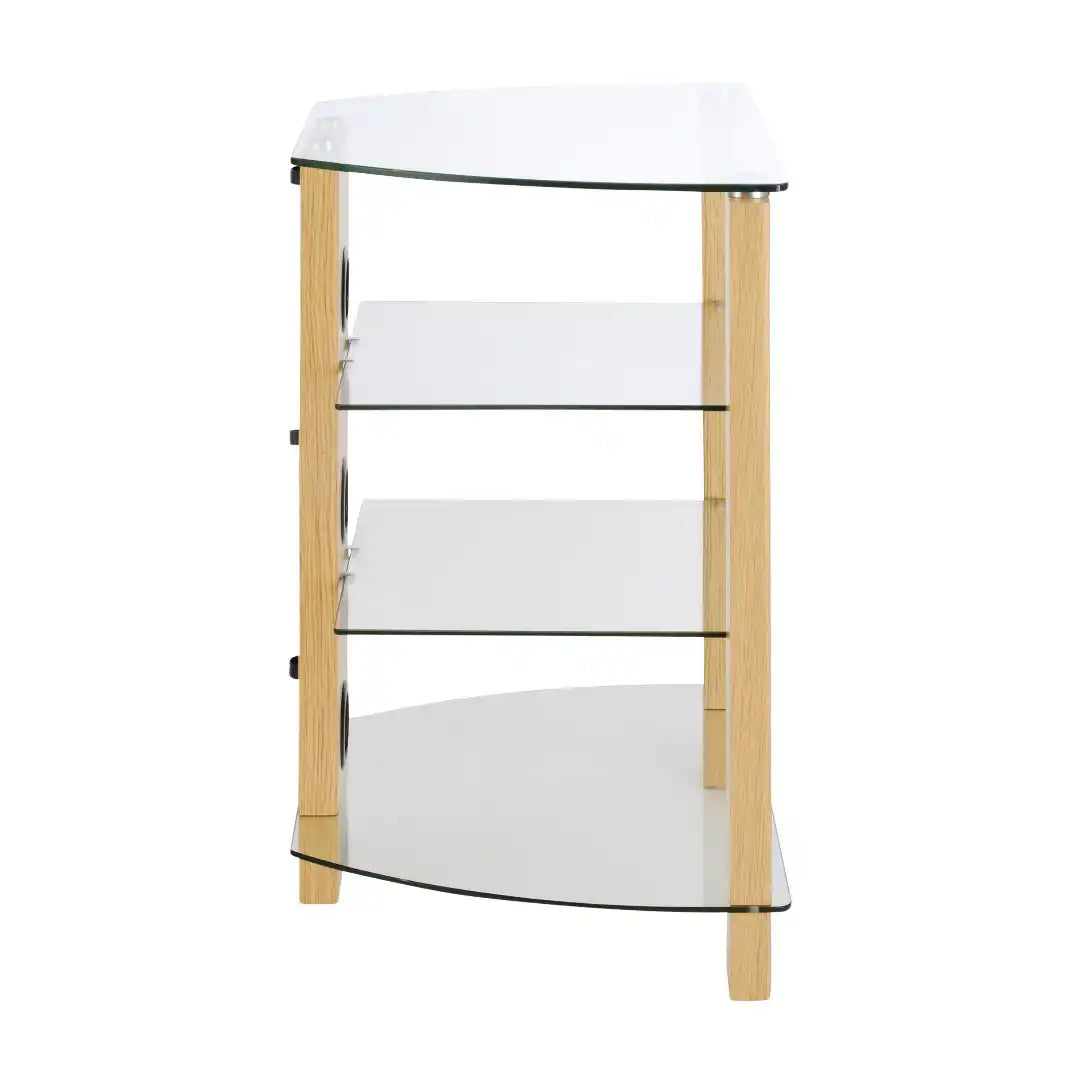 - Modern design using contrasting laminated wood legs and four toughened glass shelves