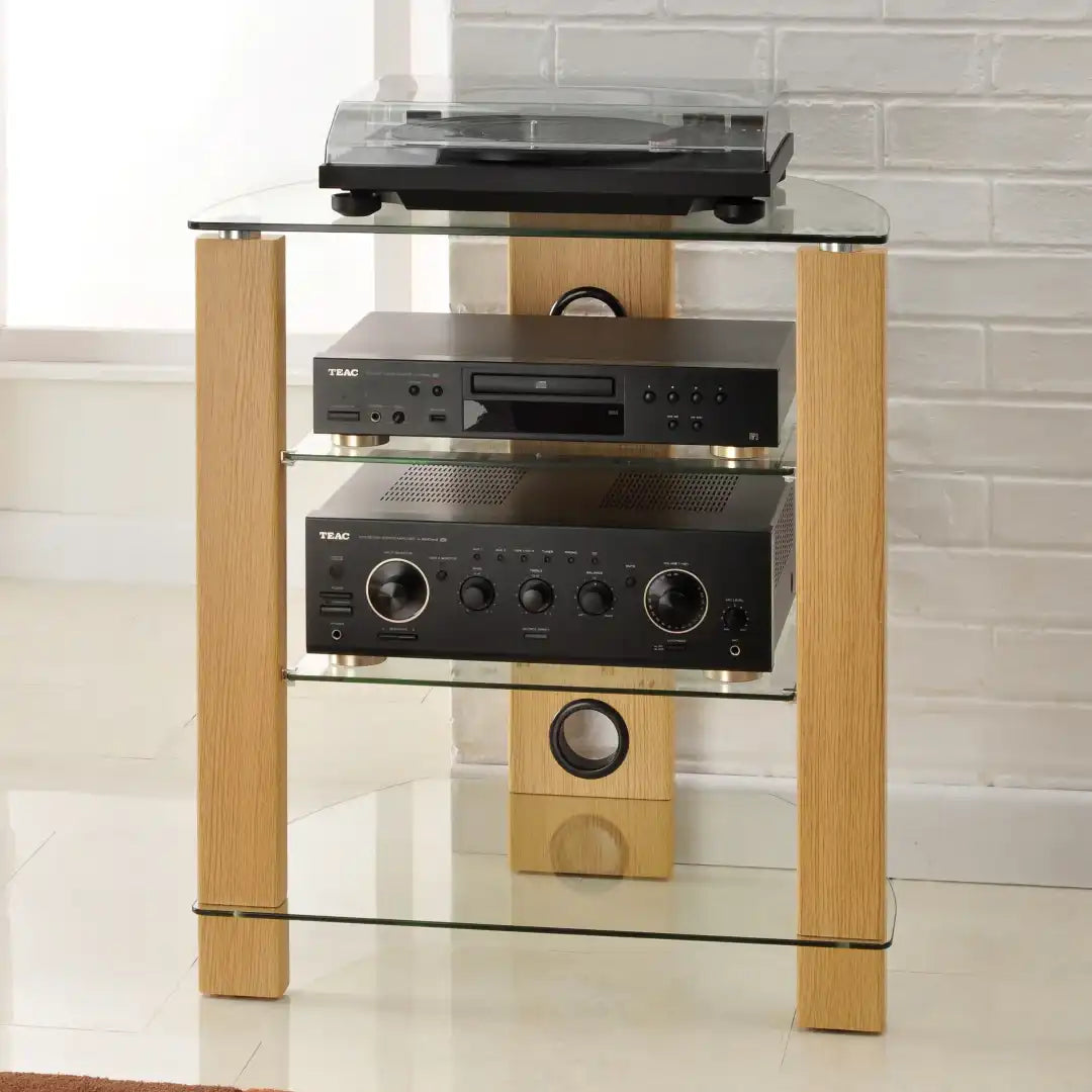 Featuring tempered glass shelves and wide legs, the Vision rack is sturdy enough to cope with the demands of a complete Hi-Fi system. Four shelves provide plenty of space for a turntable, CD player, streamer, and audio amp.