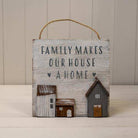 White Wooden Home Sign 'Family Makes Our House A Home' With Grey, White and Brown Stand Out Houses